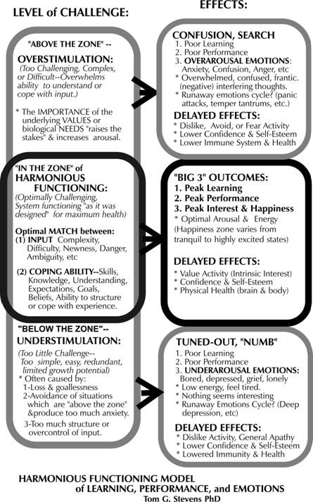 [19] A diverse set of research findings support some of the main ideas of the harmonious functioning model. For example, research supports the famous Yerkes-Dobson Law that maximum performance of (especially complex) tasks occurs at an optimal level of motivational arousal--too low arousal leads to apathy, low energy, slowed performance and too high arousal leads to confusion, increased errors, distractions, or overshooting. (See Brehm, J. W. and Self, E. A. 1989)