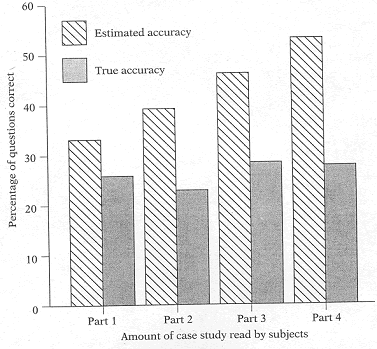 After reading the first part of the case study, subjects answered 26 percent of the questions correctly (slightly more than what would be expected by chance), and their mean confidence rating was 33 percent. These figures show fairly close agreement. As subjects read more information, though, the gap between confidence and accuracy grew (see Figure 19.1). The more material subjects read, the more confident they became-even though accuracy did not increase significantly with additional information. By the time they finished reading the fourth part of the case study, more than 90 percent of Oskamp's subjects were overconfident of their answers.