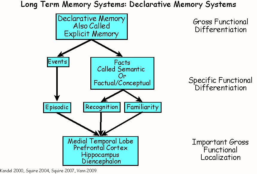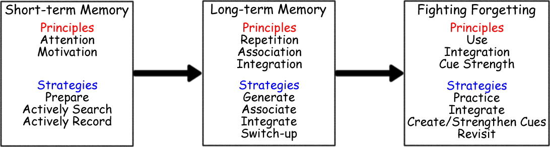 Two Types of Memory In contrast, when one learns an association, procedure, skill, or process one uses a non-declarative memory system. Non-declarative memory is neither explicitly represented nor easily accessible to consciousness. Moreover, encoding in non-declarative memory involves modifications to specialized performance systems--i.e., modifying processes--and is thus is relatively modal-specific (specific to the memory system and generally specific to the context). For instance, the encoding of many non-declarative memories involves a gradual encoding of commonalities or patterns in events or in a series of events. For instance, professional basketball players have been encoding commonalities in how to make free-throws since they were kids. Recall occurs in non-declarative memory by recreating the process or performance. For example, procedural memory encodes information about how to ride a bike by associatively encoding motor sequences. When you use your procedural memory to ride a bike, you don’t recall information. Rather, the associated motor sequences are reactivated during the performance of bike riding (recall). Motor sequences are not the only type of processes that one learns using non-declarative memory. For instance, problem solving, writing, and similar processes also involve non-declarative memory. The best way to learn an association, procedure, skill, or process is through making the association, performing the procedure, exercising the skill, or going through the process. Specifically, trying to perform the task without help or feedback followed by getting feedback on your performance, followed by trying again using that feedback works best for learning associations, procedures, skills, or processes. In other words, do problems! Of equal or greater importance, expend serious time and effort trying to solve the problem BEFORE checking the answer or asking me, when you check the answer or get feedback make sure you understand where you went wrong, then do at least one more problem immediately afterward.