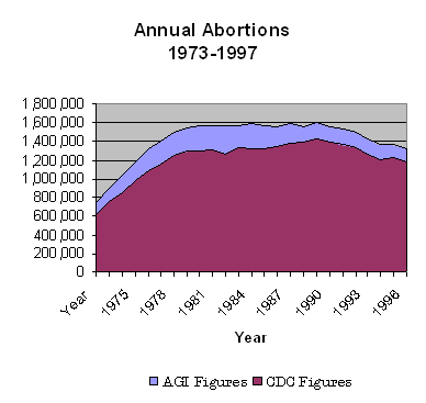 Consequences of Roe v. Wade Downward Trend Continues After reaching a high of over 1.6 million in 1990, the number of abortions annually performed in the U.S. has dropped back to levels not seen since the late 1970s.Two independent sources confirm this decline: the government’s Centers for Disease Control (CDC) and the Alan Guttmacher Institute (AGI), Planned Parenthood’s special research affiliate monitoring trends in the abortion industry. The CDC ordinarily develops its annual report on the basis of data received from 52 central health agencies (50 states plus New York City and the District of Columbia). AGI gets its numbers from direct surveys of abortionists. Because of these different methods of data collection, AGI has consistently obtained higher counts than the CDC. CDC researchers have admitted it probably undercounts the total number of abortions because reporting laws vary from state to state and some abortionists probably do not report or under-report the abortions they perform. Nevertheless, because increases and decreases in CDC and AGI numbers have until recently roughly tracked each other, both sources are thought to provide useful information on abortion trends and statistics. The CDC stopped reporting estimates for some states in 1998, making the discrepancy larger. Abortions from AK, CA, NH, and OK were not counted in 1998-99 CDC totals, and numbers for AK, CA, and NH were still missing from 2000-2002 CDC figures. For those areas that did report, additional declines were seen between 1998 and 2001. The CDC reported a slight increase in 2002, in contrast with the AGI numbers showing a slight decrease. The AGI figures for 2001 and 2002 are estimates based on abortion reports from over 40 states, and show a downward trend. AGI estimates that abortions decreased in 2002, to the lowest number since 1976. Using AGI figures through 2002, estimating 1,293,000 abortions for 2003-05, and factoring in the possible 3% undercount AGI estimates for its own figures, the total number of abortions performed in the U.S. since 1973 equals 47,282,923.