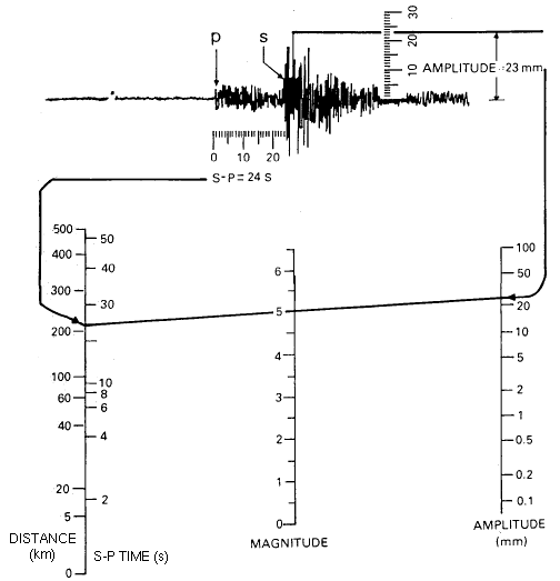 A rather handy graph lets you estimate the local (Richter) magnitude of an earthquake if you know both the maximum amplitude of the ground motion, measured in millimeters as traced on a particular kind of seismograph (Woods-Anderson) and the difference in time between the first record of the primary wave and the first record of the secondary wave on the seismograph. In Figure 3, you see the use of the nomogram for an earthquake producing a 23 mm maximum amplitude trace and a 24 second lag between the primary and secondary waves' arrival. The difference in arrival times corresponds to a distance of just over 200 km and a magnitude of 5.0.