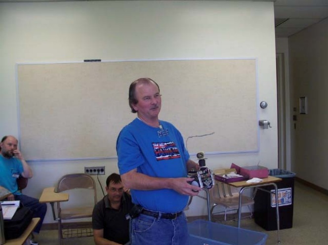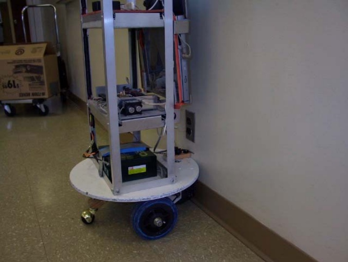Jim built his own sensing device to find the outlet. It consisted of a laser and 3 light sensors mounted in an empty 35mm film canister which was mounted on two RC servos so that it could rotate 360 degrees. The rules allowed a beacon at the outlet, and Jim put together a passive reflective beacon using corner reflector type auto reflectors from Pep Boys and a piece of black velvet in between reflectors. His robot would scan the room until it found the outlet, then approach the outlet making occasional steering corrections and usually lowered a pointer right onto the outlet. As usual, he did all this with a Basic Stamp with 26 bytes of RAM.