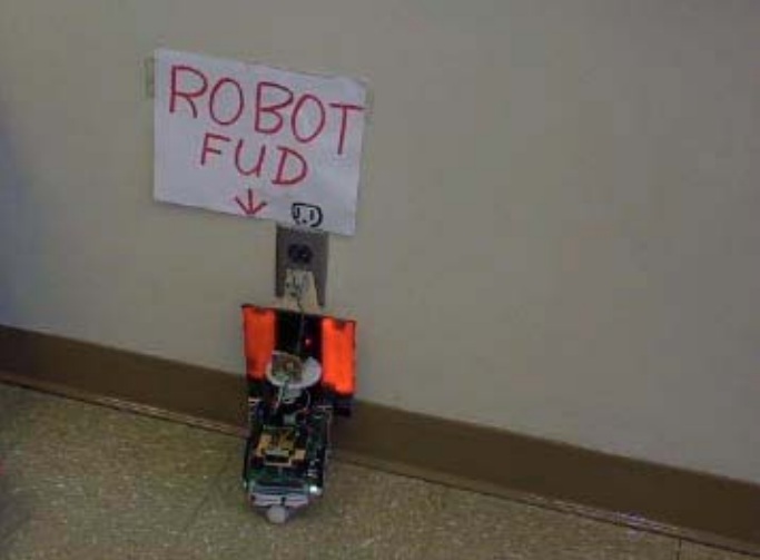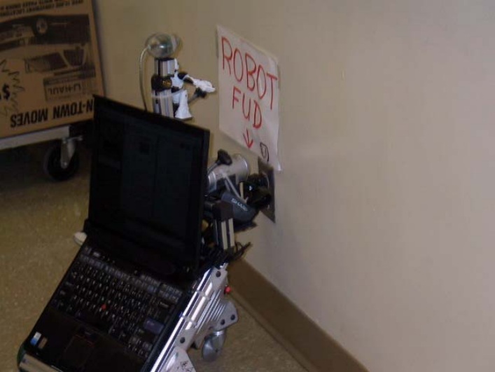 A contest was held which had the objective of the robot finding an electrical outlet on the wall in the front of the room as accurately as possible, and with the optional objective of actually plugging in a real plug. There were 4 entrants, however only three ran since Martin accidently smoked his processor just before the contest. Oh well, these things happen ;-)