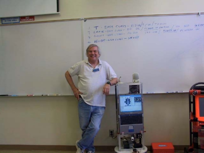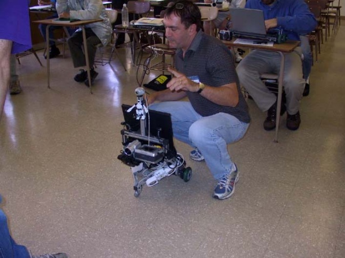 Alex relocated Rocky’s webcam from the top of the robot to just above wall socket level. He used Compass , sonar and deadreckoning to search along the wall. Steven Gentner’s RoboRealm (Roborealm.com) software was used to detect the outlet and to provide navigation data to approach it.