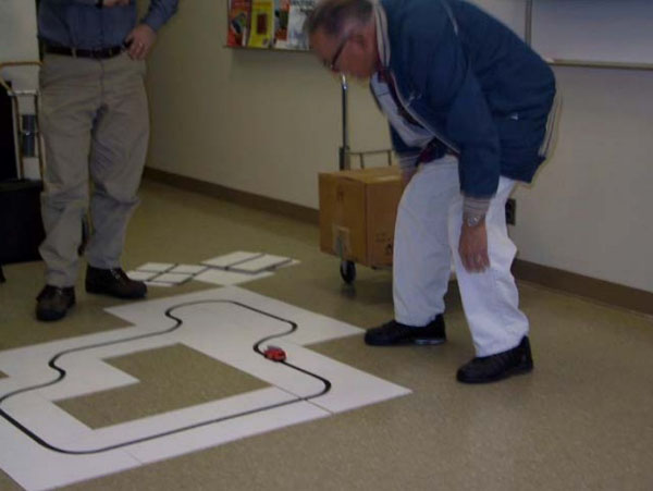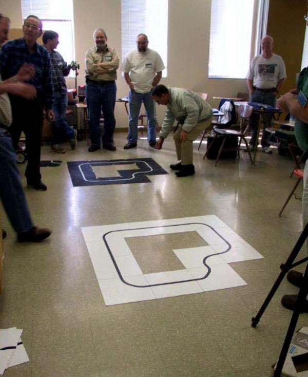 This contest was held in conjunction with students from Mt. San Antonio college. About 8 people competed on identical contest courses of either black tape on white tiles, or white tape on black; or in one case, the same robot ran on both.